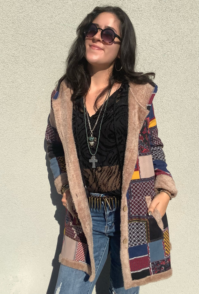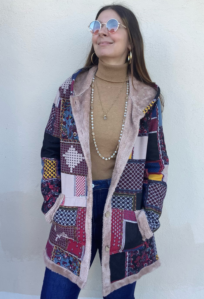 The prettiest vintage style patchwork print highlights this button front, front patch-pocketed, hooded, fake fur lined coat. A slightly oversized fit.
