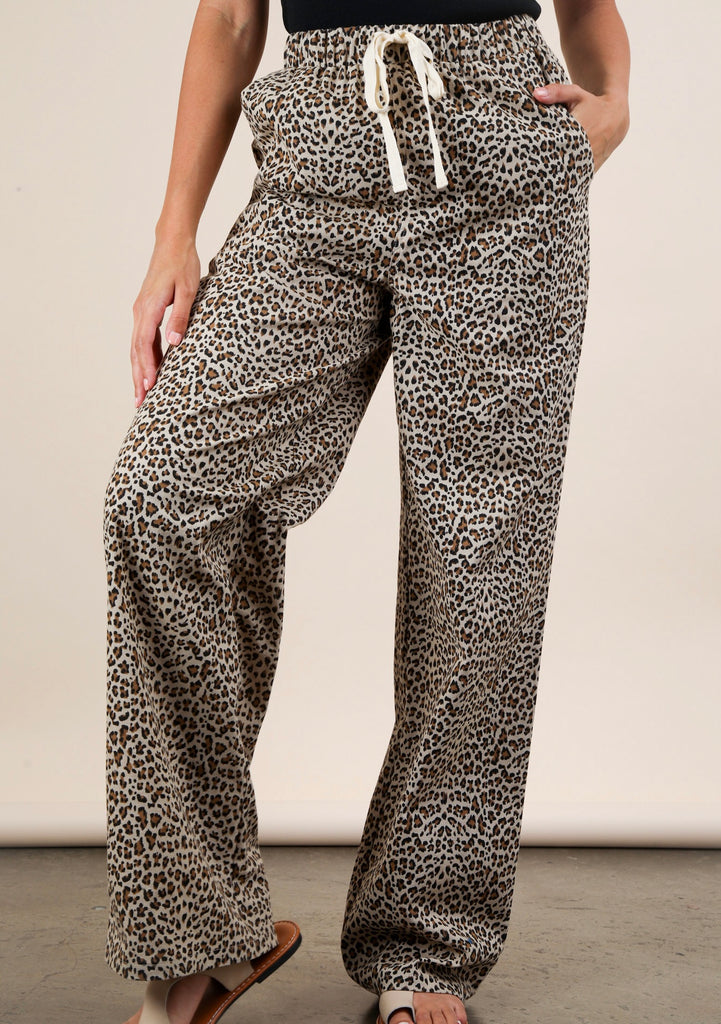The cutest linen-look leopard print enhances these adorable elastic waist, drawstring adjustable, front pocketed pants.