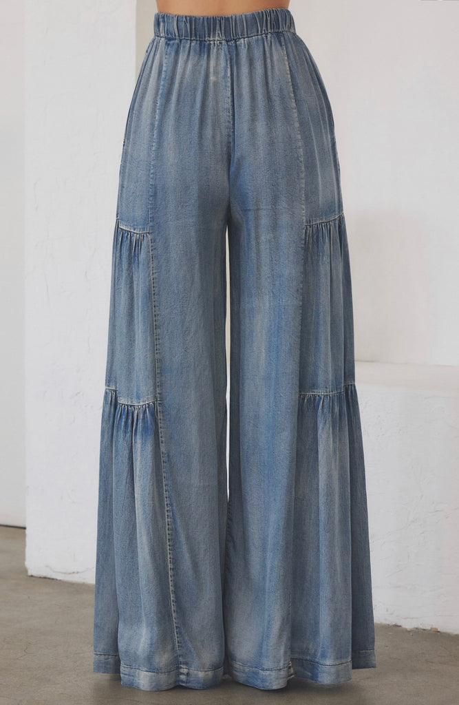 The softest chambray denim fabric highlighter these flowy, wide-leg, shirred, elastic waist, drawstring pants.