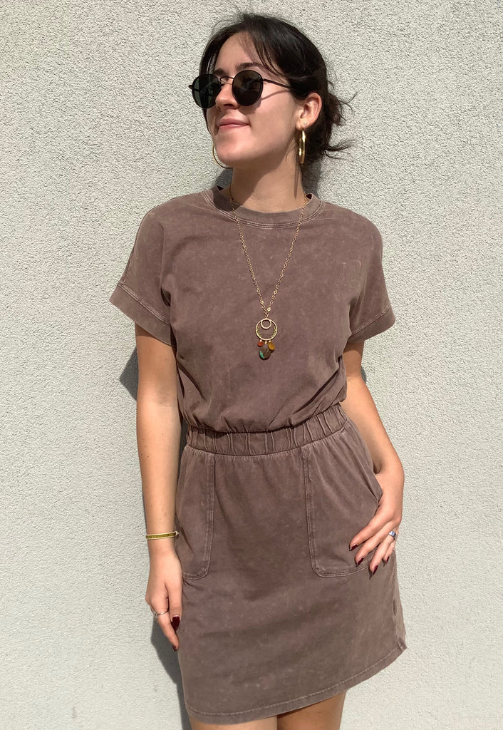 The softest, mineral washed jersey highlights this comfy, elastic waist, front pocketed dress.