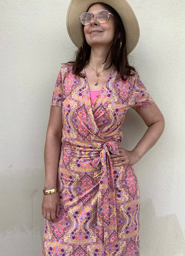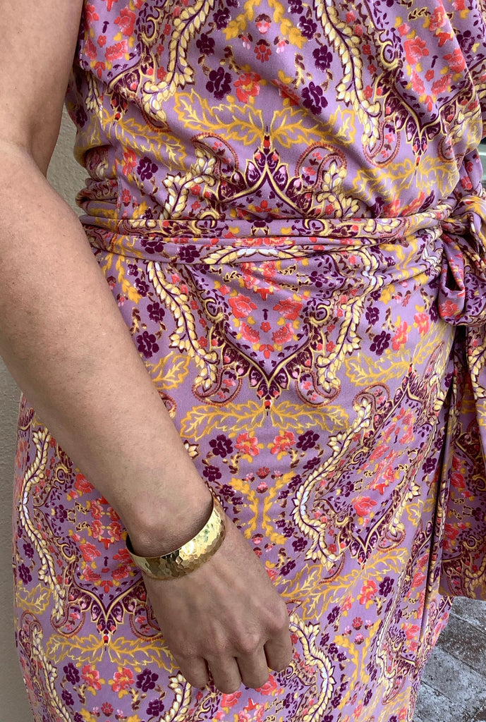The loveliest artist-designed floral print highlights this gorgeous v-neck, wrapped, midi dress. .