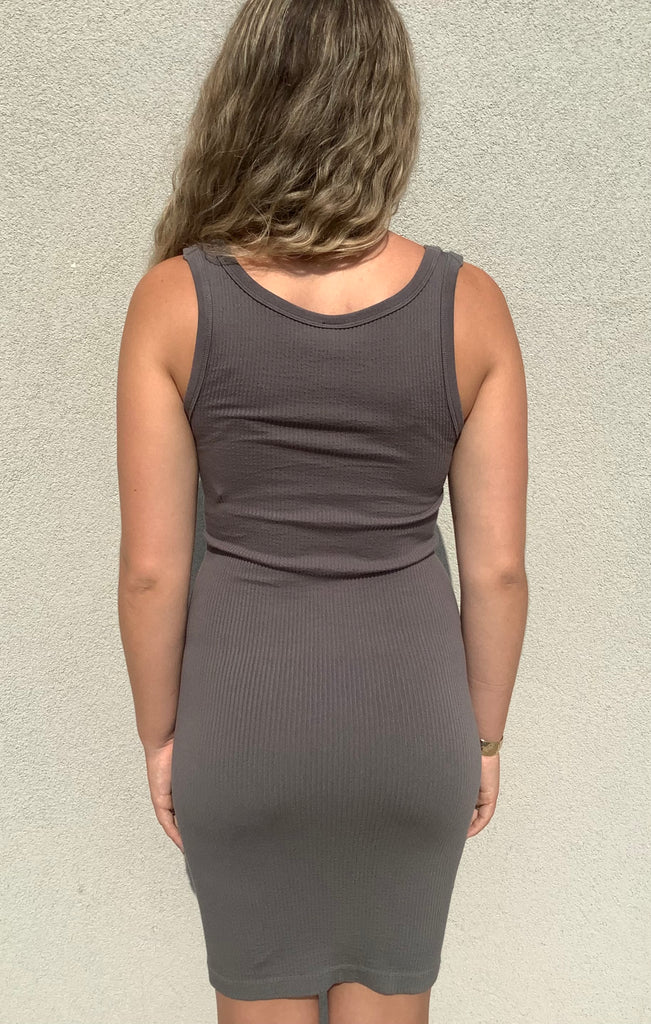 The softest ribbed jersey knit highlights this gorgeous, body-con, scooped neck dress.