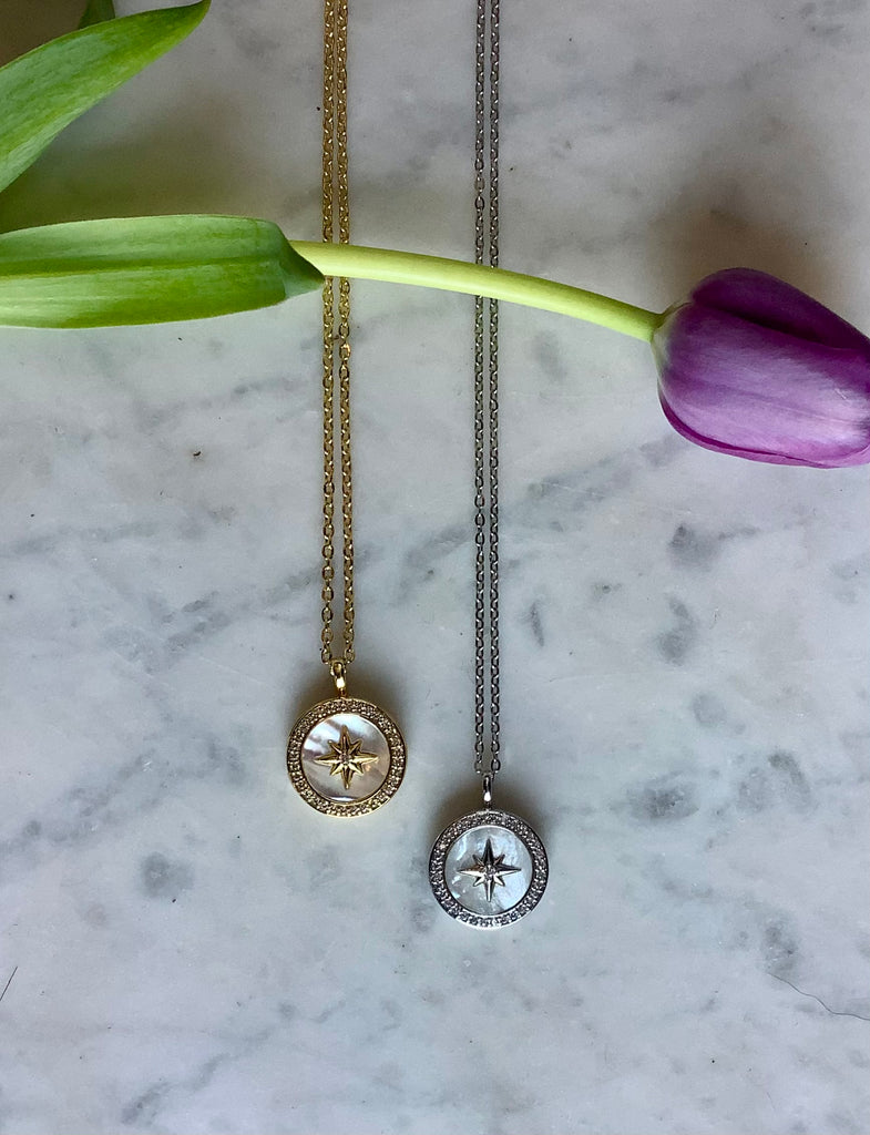 The prettiest mother of pearl pendant highlights this gorgeous artist made, locket necklace. 18-21” adjustable length.
