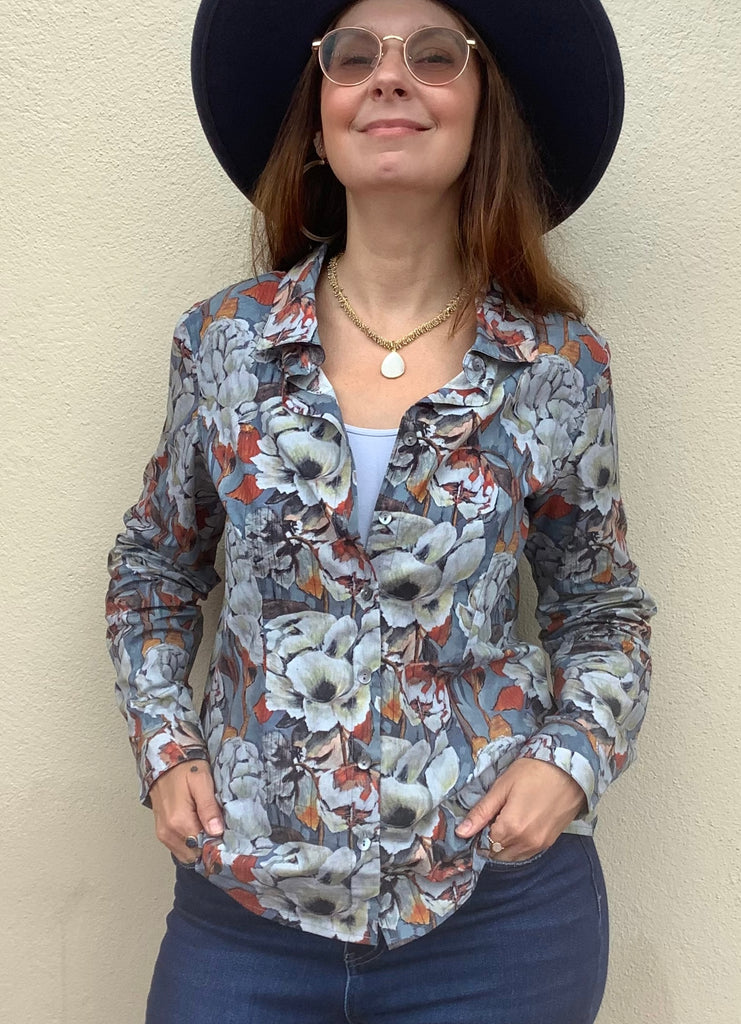 The prettiest artist designed floral print highlights this gorgeous button front/cuff, slightly fitted, dressy blouse. Perfect denim update!