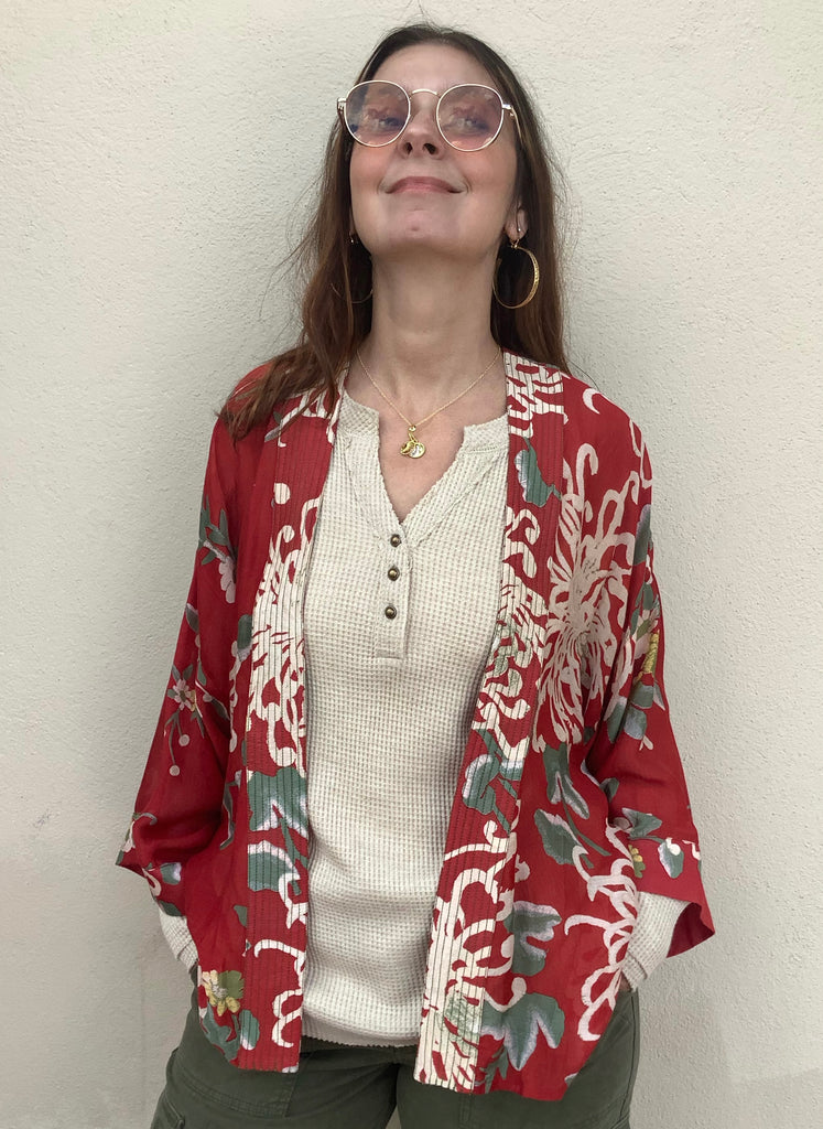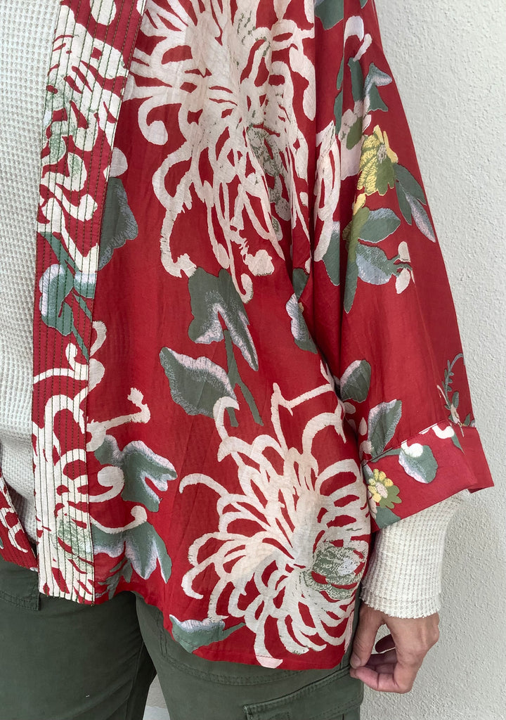 The loveliest all-over, artist-designed floral print highlights this gorgeous open-front, bell-sleeved kimono.