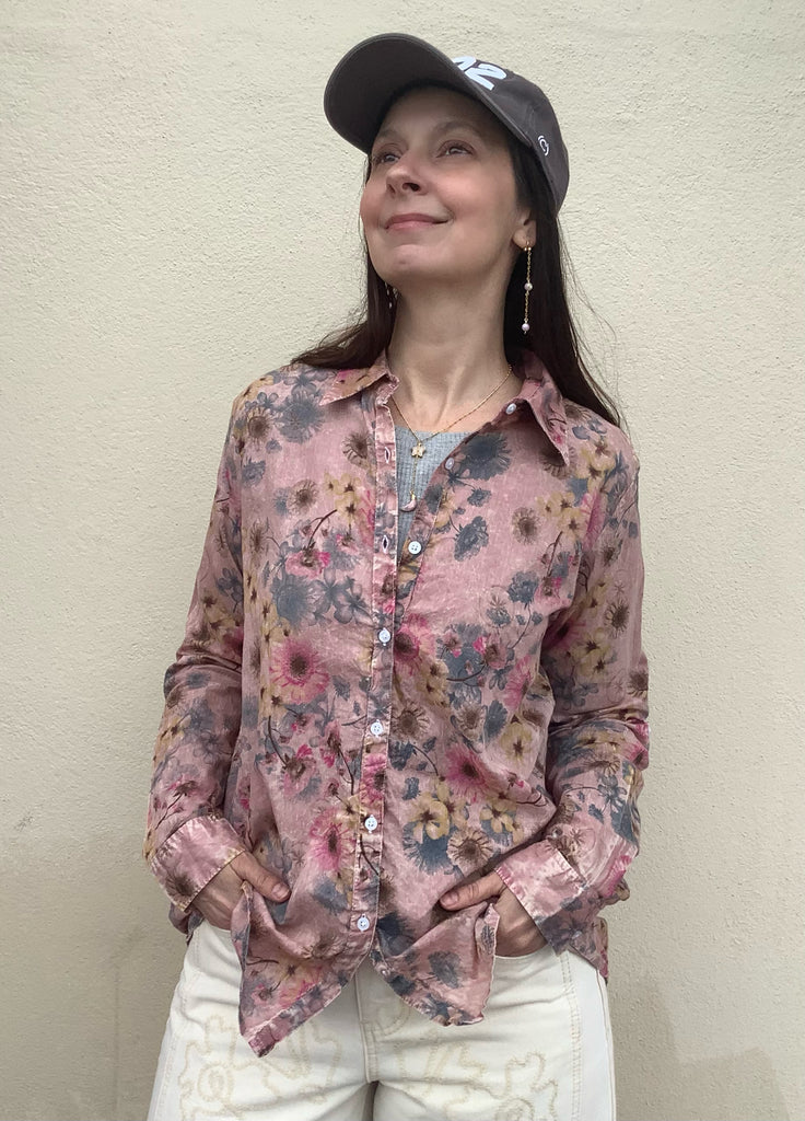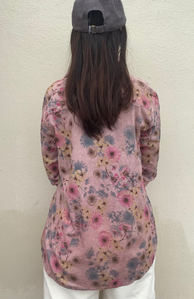 The softest mineral washed cotton and an artist designed print highlight this gorgeous, every day wear, button front/cuffs blouse.