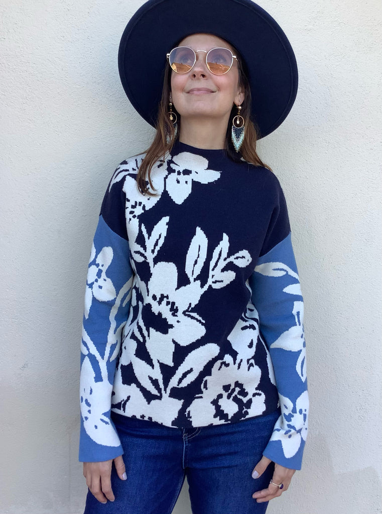 The loveliest floral intarsia enhances this beautiful two-toned, all-over patterned, mock-neck sweater. Perfect accompaniment to any shade of denim.