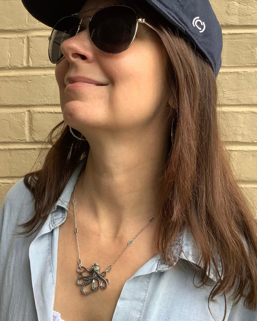The cutest hand-cast pewter Octopus pendant is highlighted with iridescent peacock crystal eyes. 18-20”adjustable length.