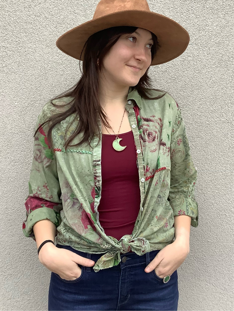 The loveliest floral patchwork and hand-stitching enhance this adorable button front/cuff, super soft, 100% cotton blouse.