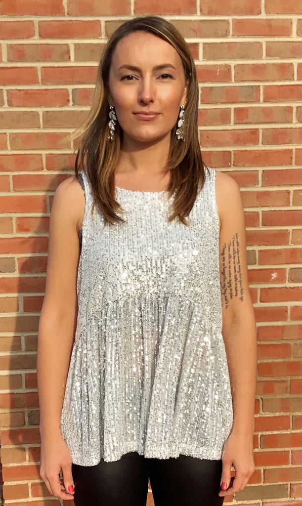 The loveliest silvery sequins enhance this racer-back, zip-back tank. A slightly loose, floaty fit.