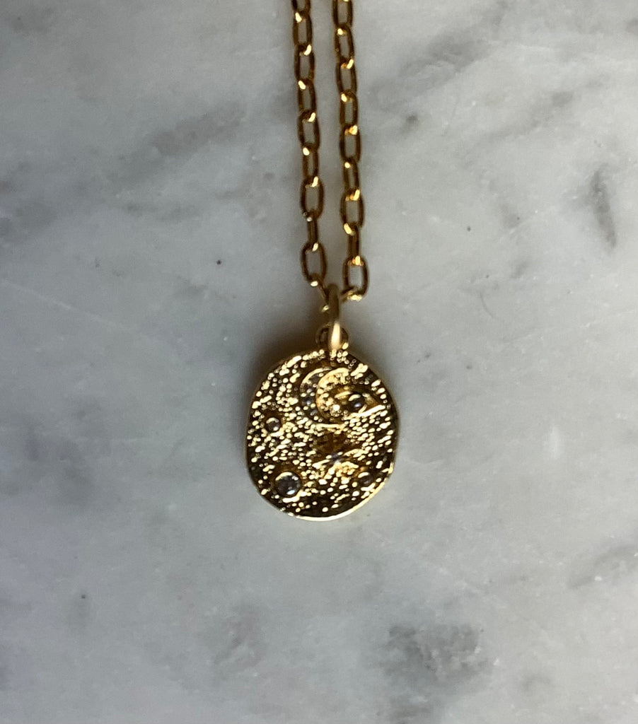 The prettiest hand-cast, artist designed moon/star pendant and cubic zirconia crystals highlight this stunning, every day necklace. 15 1/2-17 1/2” adjustable length.