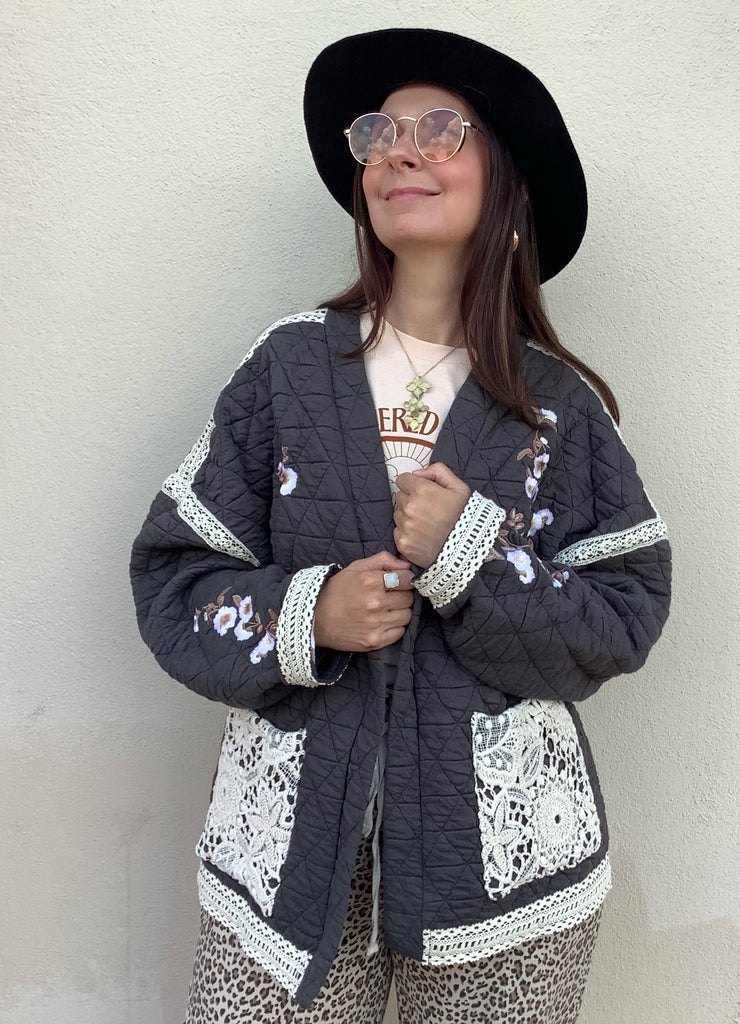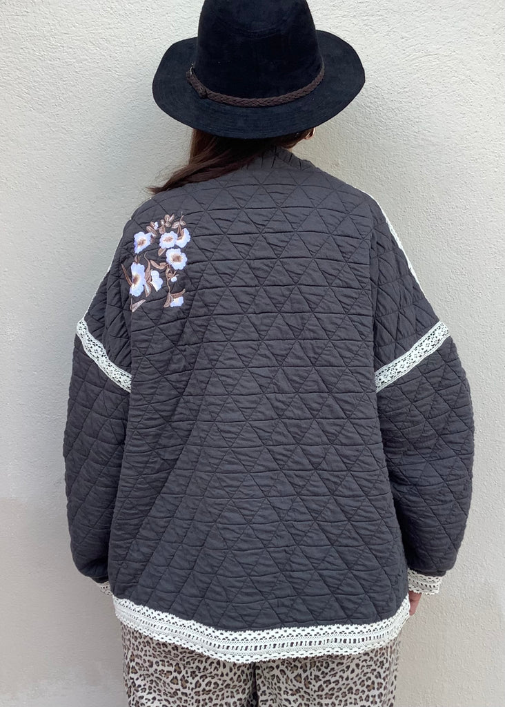 Gorgeous floral embroidery and lace trim highlight this quilted, open-front, front pocketed, lightweight jacket.