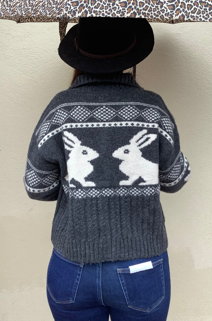The prettiest bunny and fairaisle intarsia highlights this gorgeous button front, ribbed neck/placket, slightly cropped cardigan.