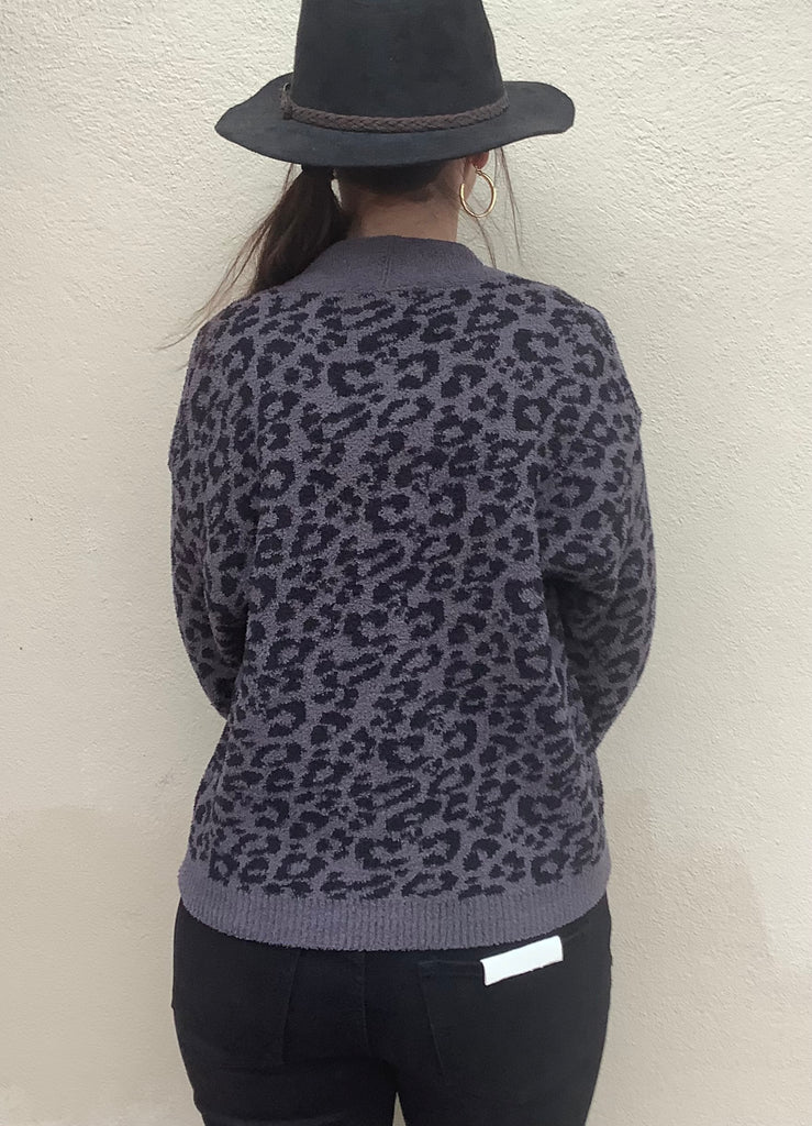 The softest, loftiest yarn enhances this all-over leopard patterned, button front, pocketed cardigan. The perfect layering piece for early Spring.