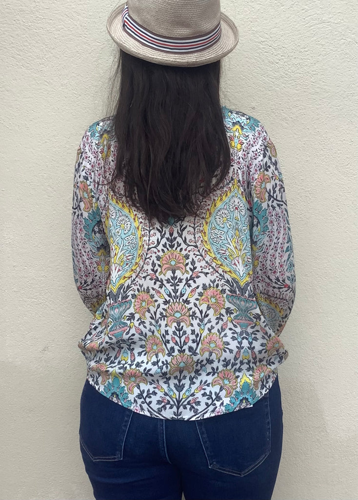 The loveliest artist-designed paisley print enhances this gorgeous v-neck, tie-front, elastic cuff, floaty blouse.