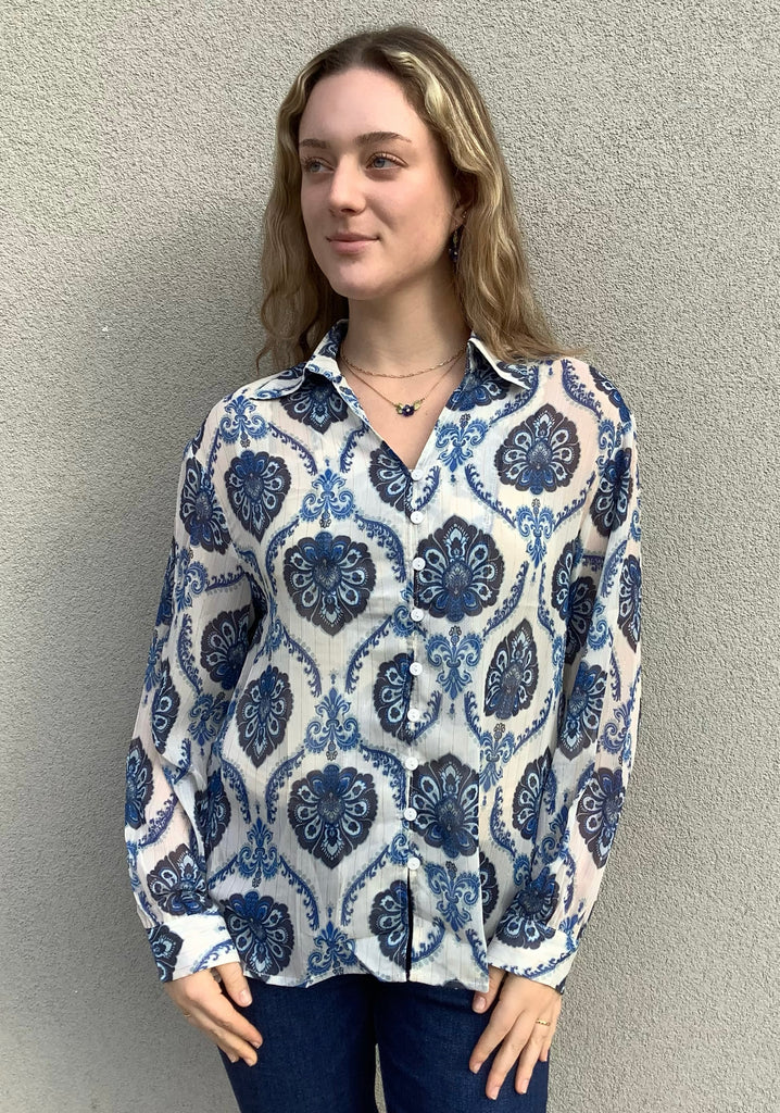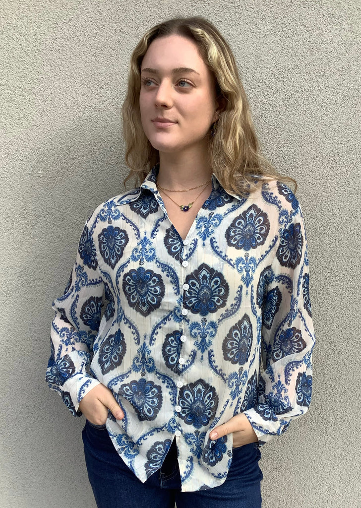 The prettiest blue and white paisley and gold lurex stripes highlight this gorgeous, notched-collar, button-front, floaty semi-sheer blouse.