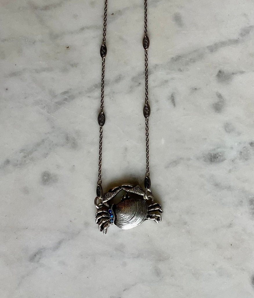 The cutest, hand-cast blue-crab pendant and opalescent crystals highlight this gorgeous, every day necklace. 18-20” adjustable length.