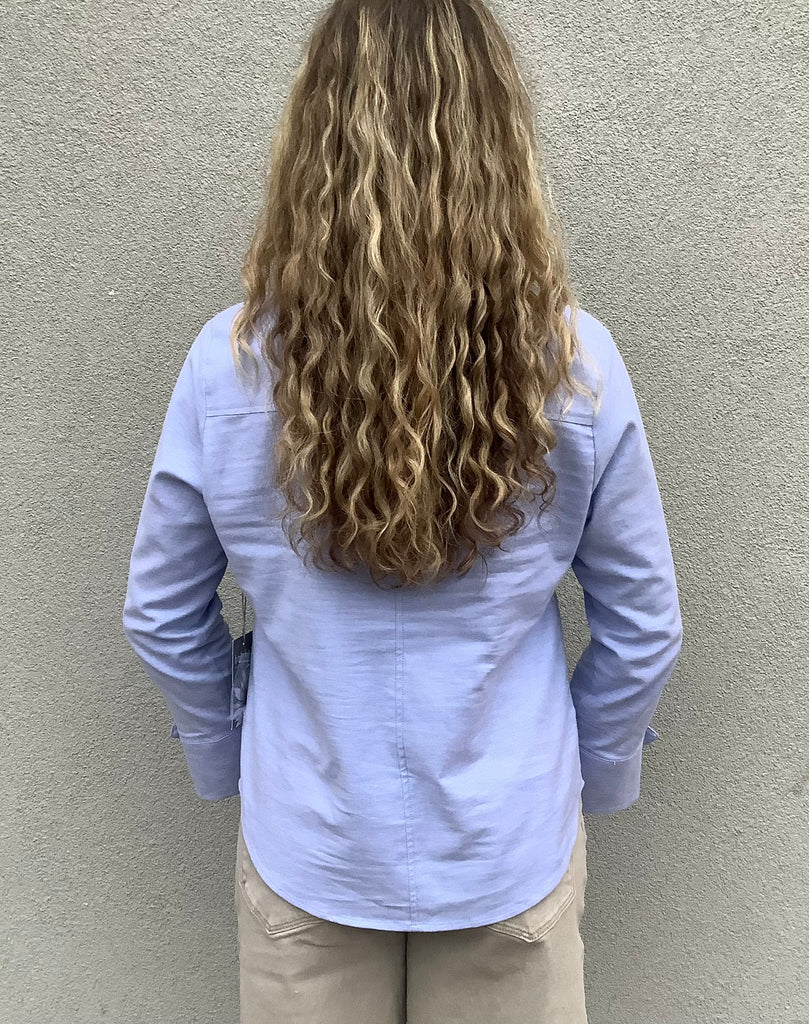 The softest cornflower blue Oxford cloth and adorable tabbed front/sleeve closure highlights this everyday wear, yoked-back blouse.