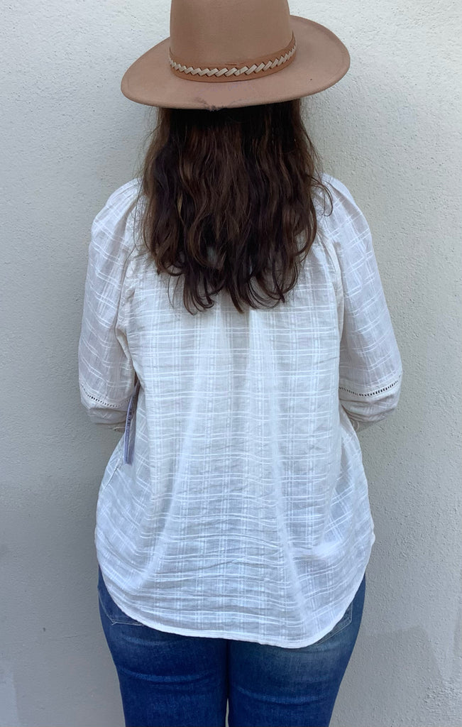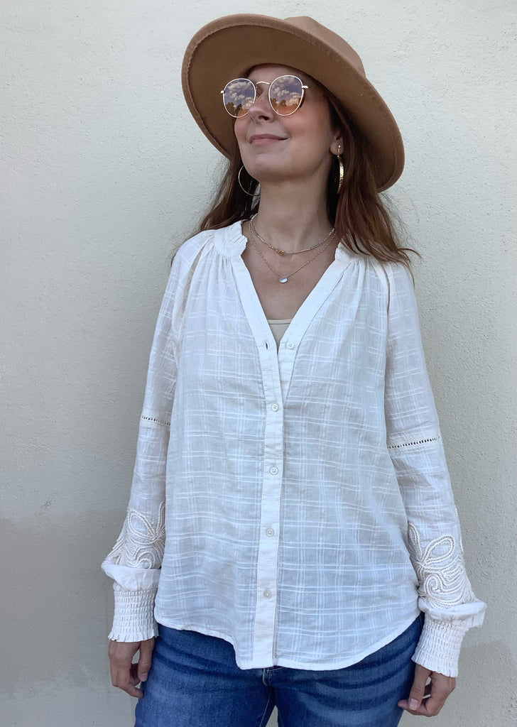 The loveliest shadow-striped fabric highlights this stunning, button front, elastic cuffed, gathered, embroidered sleeve blouse.