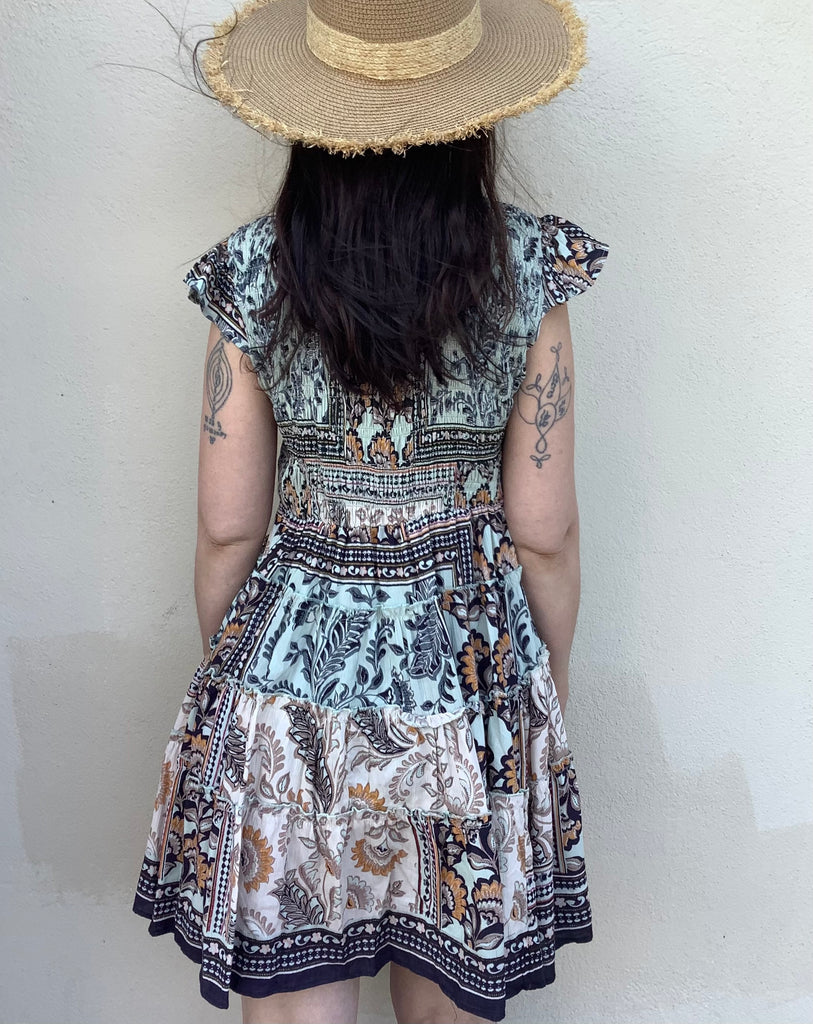 The softest printed cotton patchwork and smocking enhances this adorable, flounced, flutter sleeved, border-print dress.