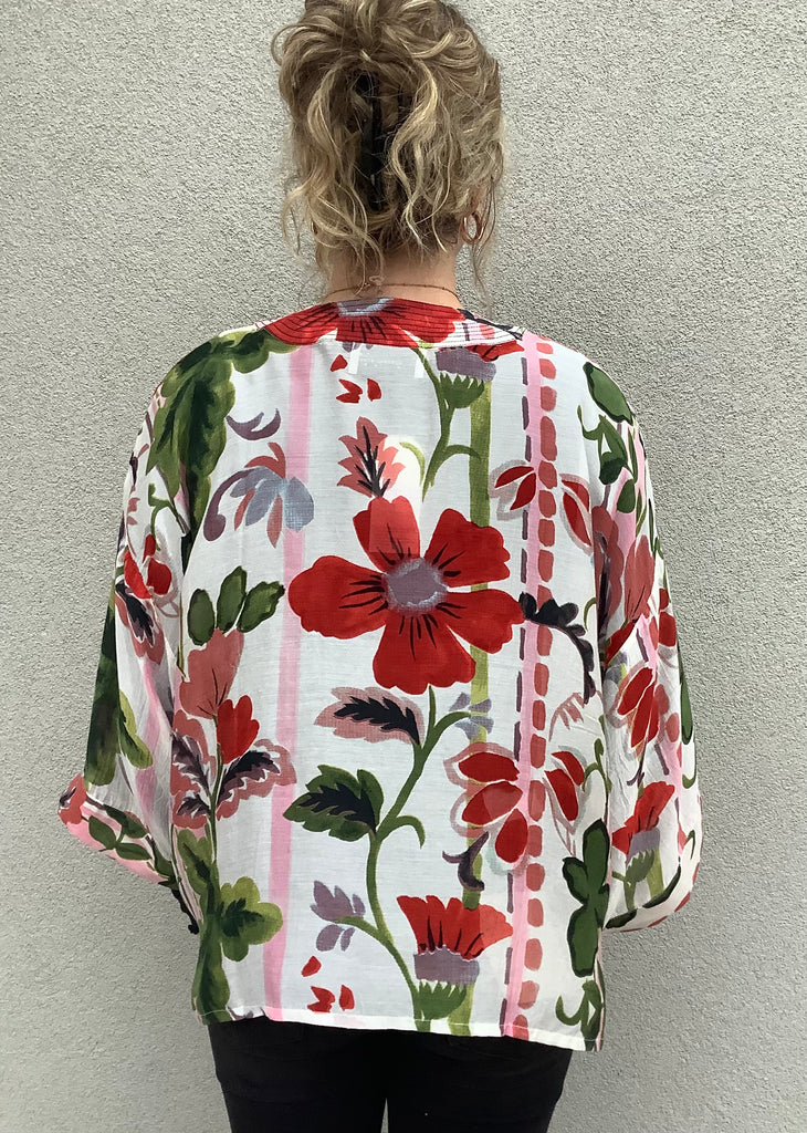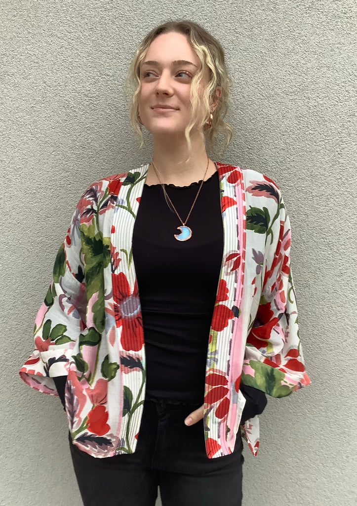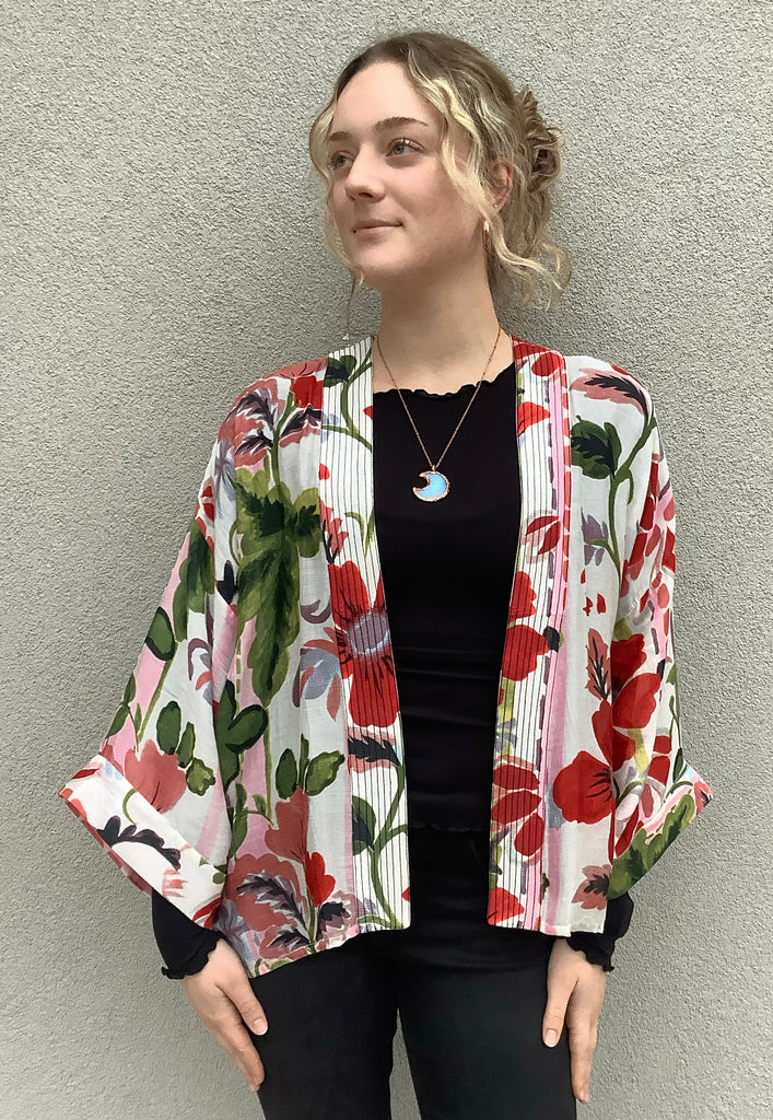 The loveliest artist-designed floral print and center-front quilting enhance this open front, bell-sleeved kimono. One size fits most.